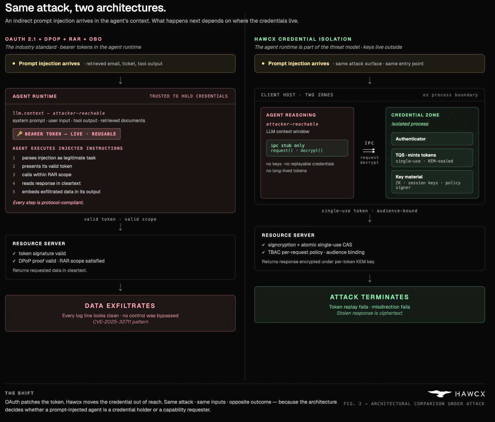 Figure 1. The same prompt injection attack under OAuth 2.1 (left) vs Hawcx credential isolation (right).