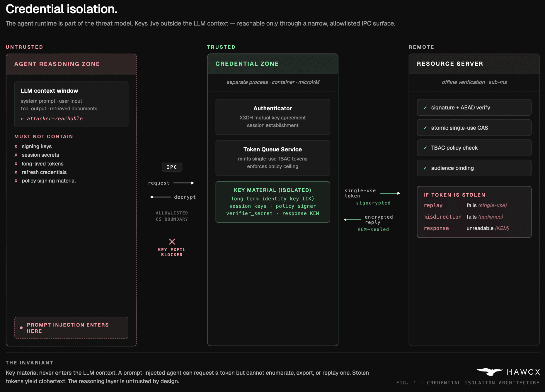 At Hawcx, we've been building toward the architecture this post describes. Our protocol, submitted as public input to the NIST NCCoE concept paper on AI agent identity and authorization earlier this year, implements credential isolation via OS-level process separation, single-use tokens with atomic consumption, bidirectional per-invocation payload encryption (both request and response bodies encrypted under keys derived from a seed inside the encrypted token body), task-based access control with constraints embedded in every token, and cryptographically distinct agent identity anchored in Ristretto255 public keys with X3DH mutual authentication.